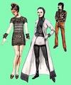 Справа - костюм на каждый день для молодого человека, рисующий идеал мужской фигуры того времени. Узкие брюки носили низко на бедрах, к ним полагались кожаная куртка на молнии и пестрые рубашки. Волосы, уложенные в живописном беспорядке, опускались до плеч.